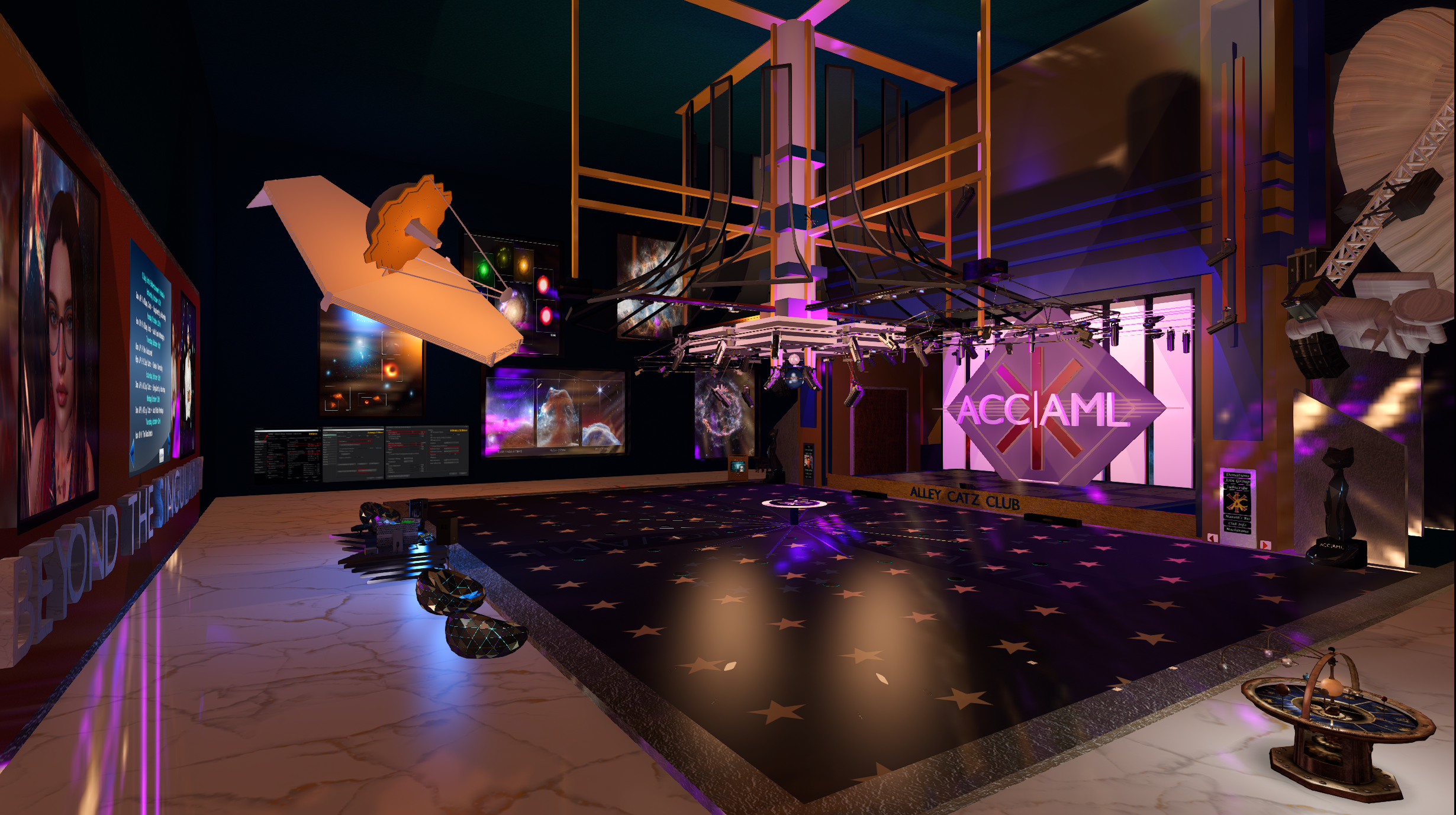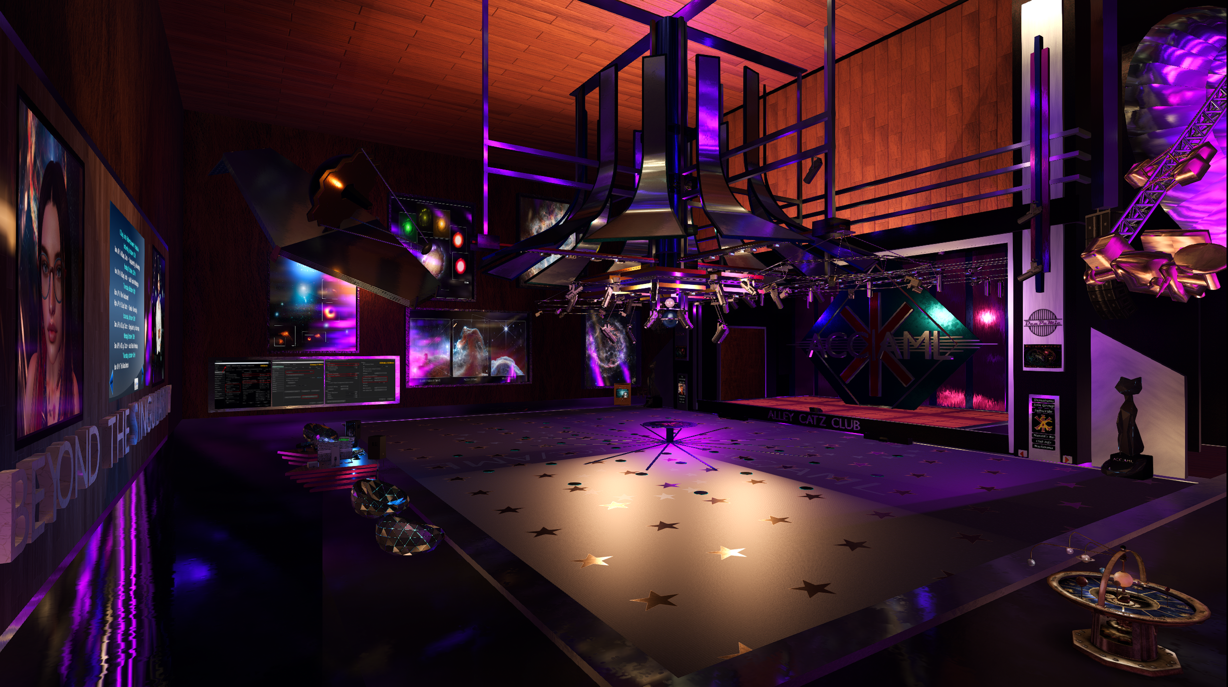 Alley Catz Club had its first inception in March 2022. Since then it has gone through a number of changes and a lot of tweaks. Quite a number of minor rebuilds have occurred over that time. With a significant rebuild in June 2024 when the venue was converted to have a cosmos theme. The build is known as “Beyond The Singularity”. Mareth (Lilith Lupindo) is the prime mover behind all these changes.